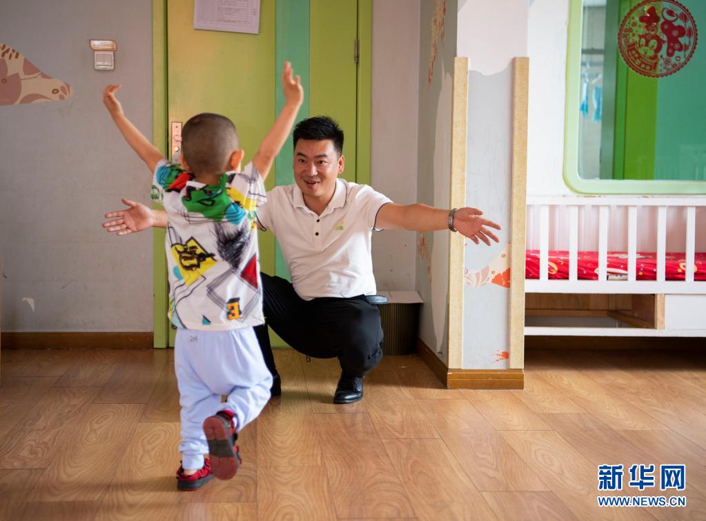 在太原市社會(兒童)福利院,一名小朋友跑向黨龍祥(5月31日攝)。新華社記者 楊晨光 攝