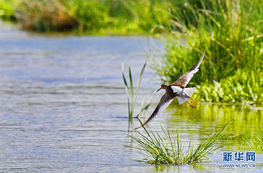 初夏,紅腳鷸在位于西藏拉薩的拉魯濕地國家級自然保護(hù)區(qū)內(nèi)起舞覓食。
