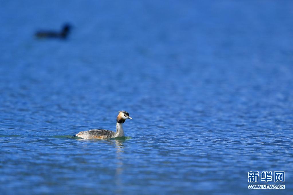 6月14日在拉魯濕地拍攝的鳳頭??。夏日里,鳳頭??和小??在西藏拉薩拉魯濕地國家級自然保護(hù)區(qū)水面上嬉戲。新華社記者 張汝鋒 攝