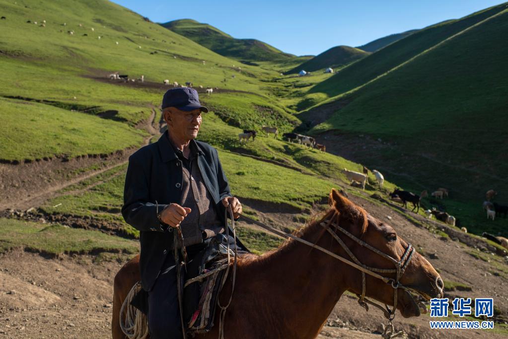 新疆裕民縣的牧民在巴爾魯克山區(qū)夏牧場上放牧(6月15日攝)。