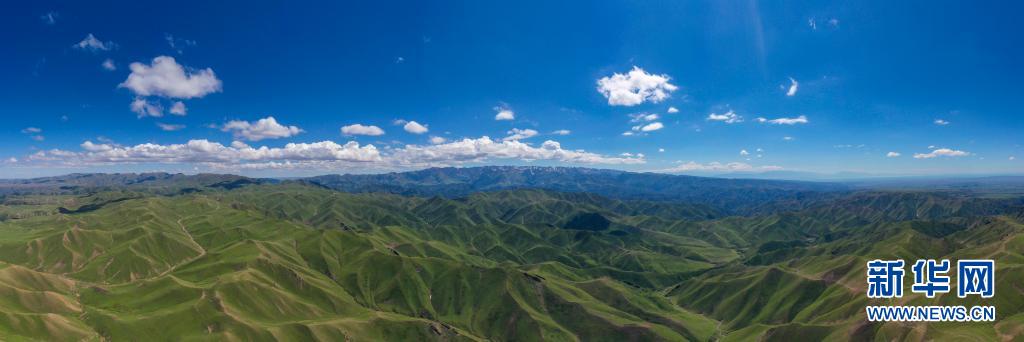 新疆北部裕民縣巴爾魯克山區(qū)夏牧場(chǎng)(6月15日攝,無(wú)人機(jī)全景照片)。