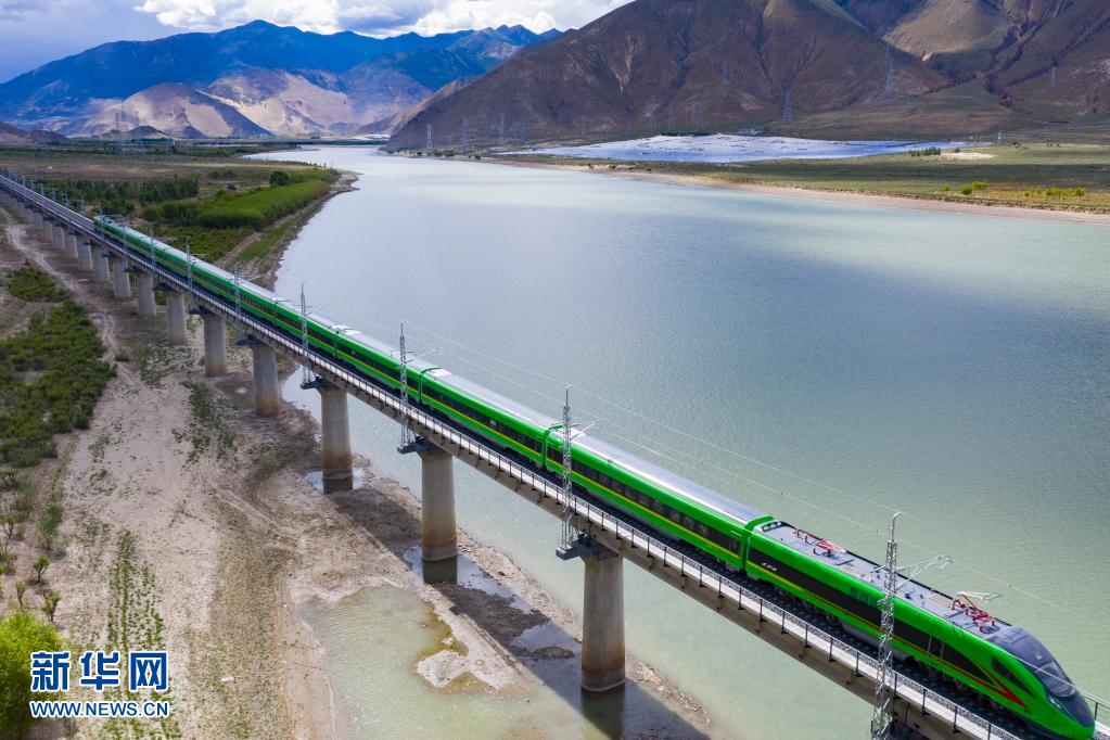 試運行的復興號列車行駛在雅魯藏布江上(6月16日攝,無人機照片)。
