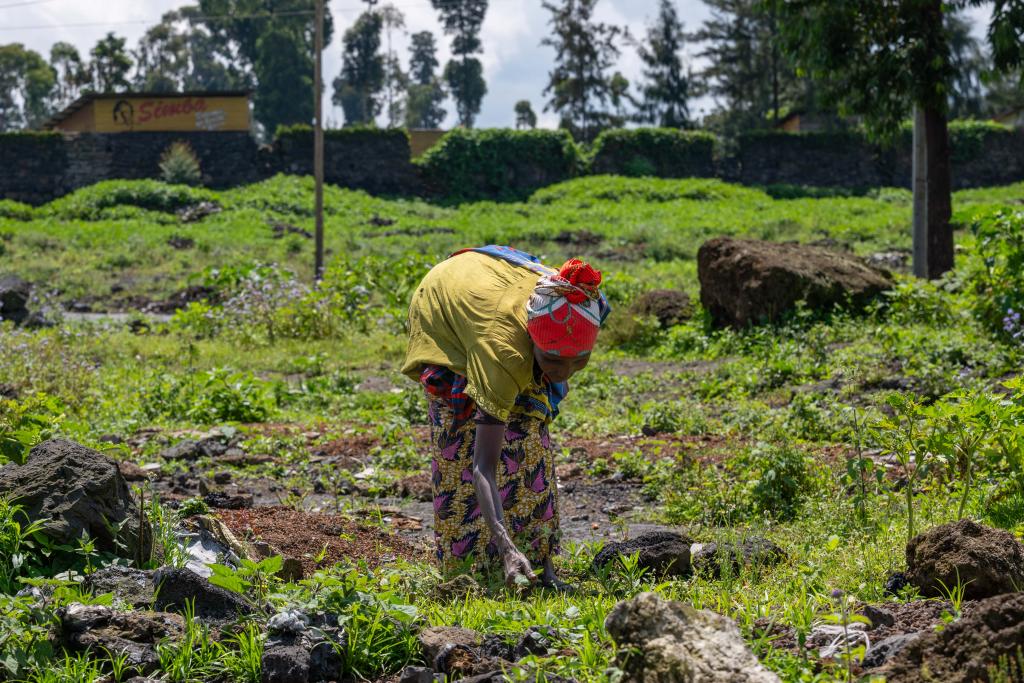 5月6日,在刚果(金)东部北基伍省戈马市郊,一名流离失所者在路边的草丛里寻找马齿苋充饥。新华社记者郑扬子摄