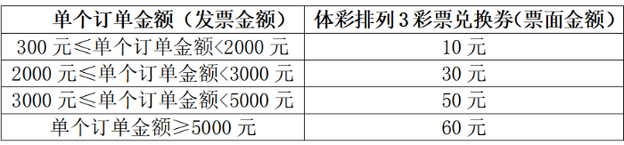 11月1日—12月7日,“苏新消费·苏彩焕新”第四期活动将全面开展。活动期间,年满18周岁的消费者,在江苏省内13个市的苏宁易购、京东五星线下直营门店购买享受国补指定商品(家电、3C商品),即有机会按单个订单消费金额(发票金额)获赠不同面值的彩票兑换券。其中,体彩赠送的是排列3彩票兑换券,兑换券以二维码形式发放。具体如下: