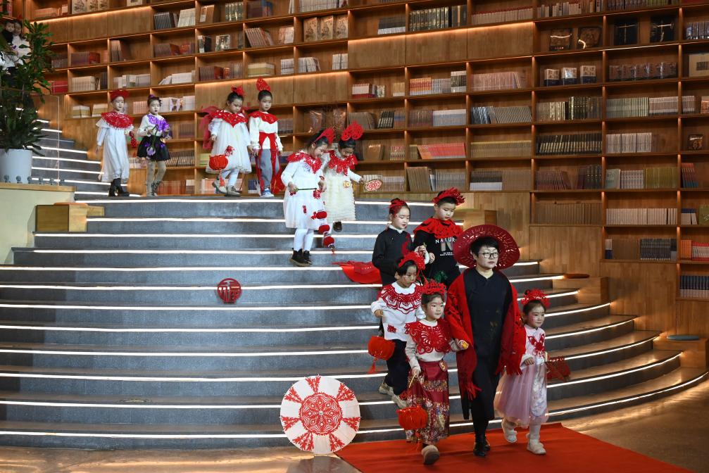 1月11日,在甘肃省敦煌市敦煌无界,十余名小朋友以走秀方式,展示自己创作的剪纸服饰作品,感受非遗魅力。