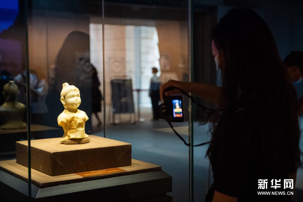 7月10日,觀眾在湖南省博物館觀看巴基斯坦出土的文物“大理石女供養(yǎng)人像”。新華社記者 陳思汗 攝