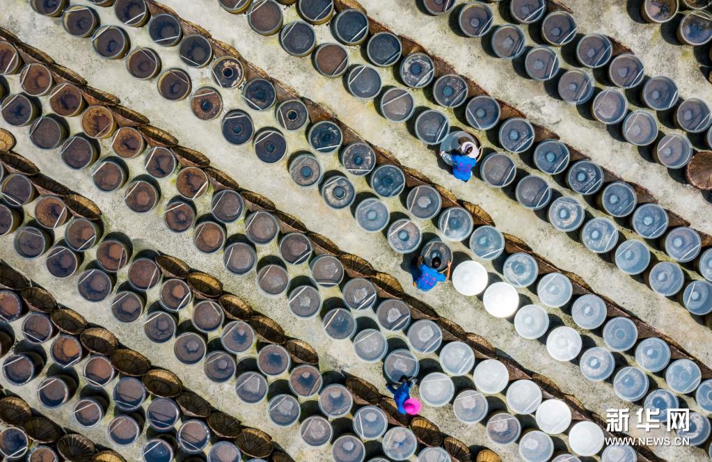 7月10日,工人在畢節(jié)市金沙縣禹謨鎮(zhèn)泡木灣醬醋基地查看醬醋晾曬情況(無人機(jī)照片)。新華社發(fā)(范暉攝)