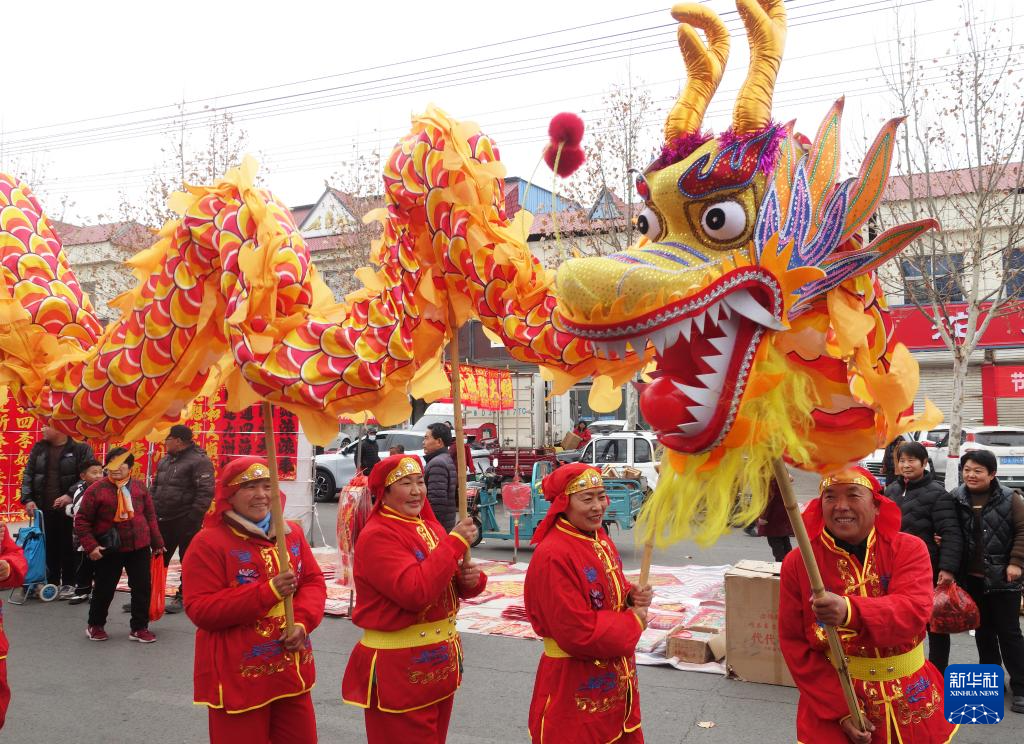 1月23日,在河南省焦作市博爱县柏山镇奉义社区,博爱空竹舞龙艺术团的艺人们为群众表演节目。