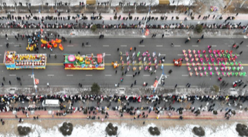 2月12日,市民游客在张家界市永定区观看巡游演出(无人机照片)。