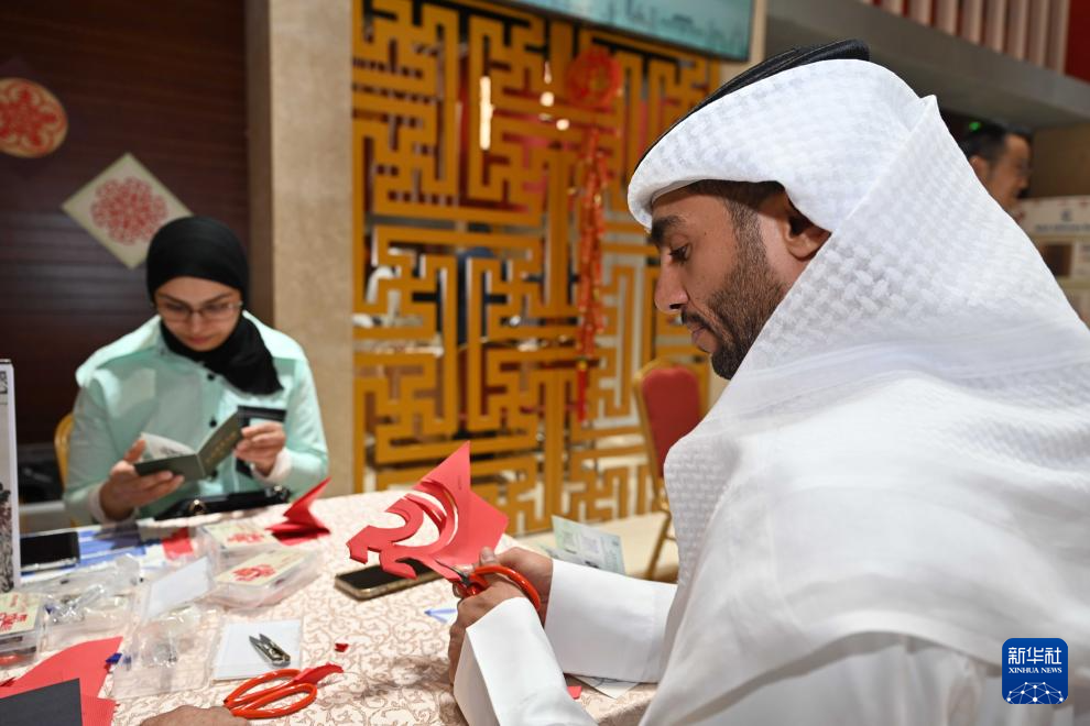 4月20日,参与者在科威特哈瓦利省举行的“国际中文日”暨使馆开放日活动中体验中国剪纸。