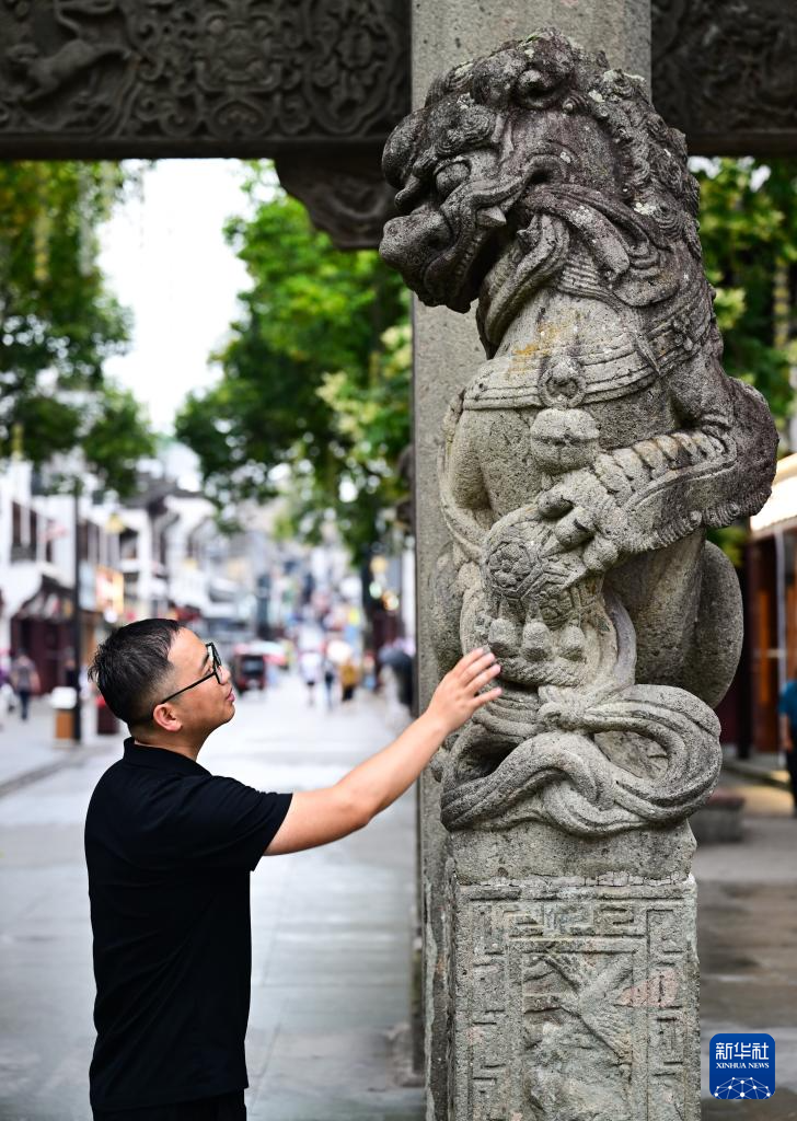 6月19日,周虎在位于歙县的全国重点文物保护单位棠樾牌坊群巡查。