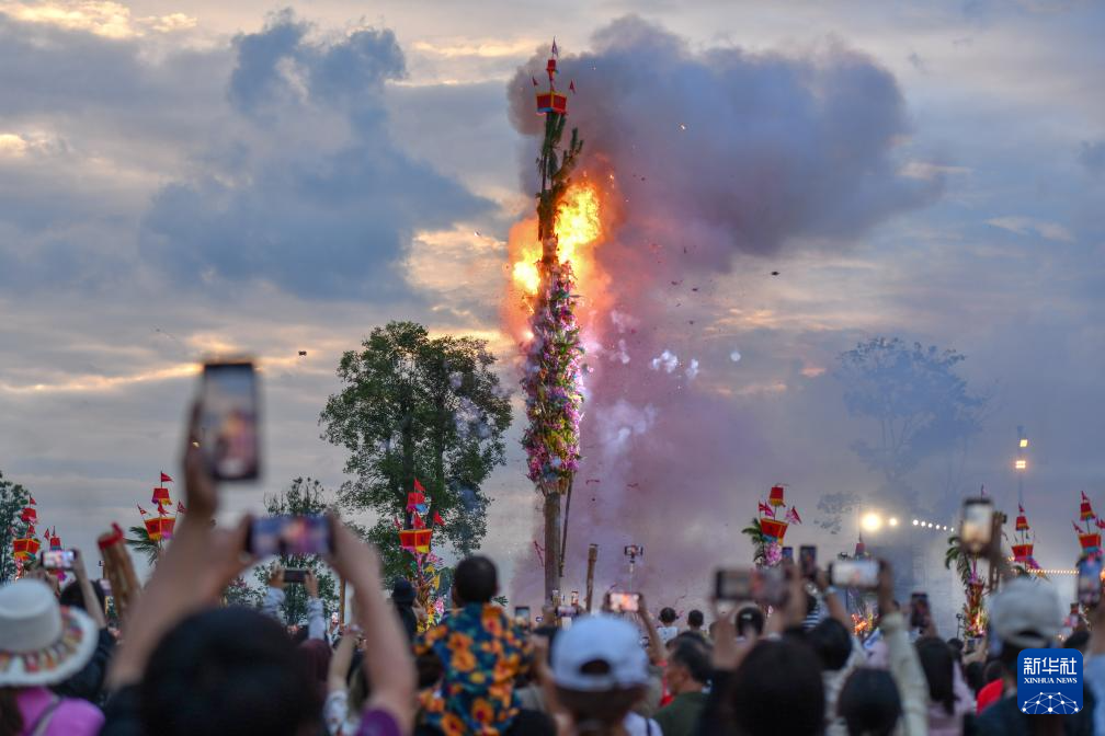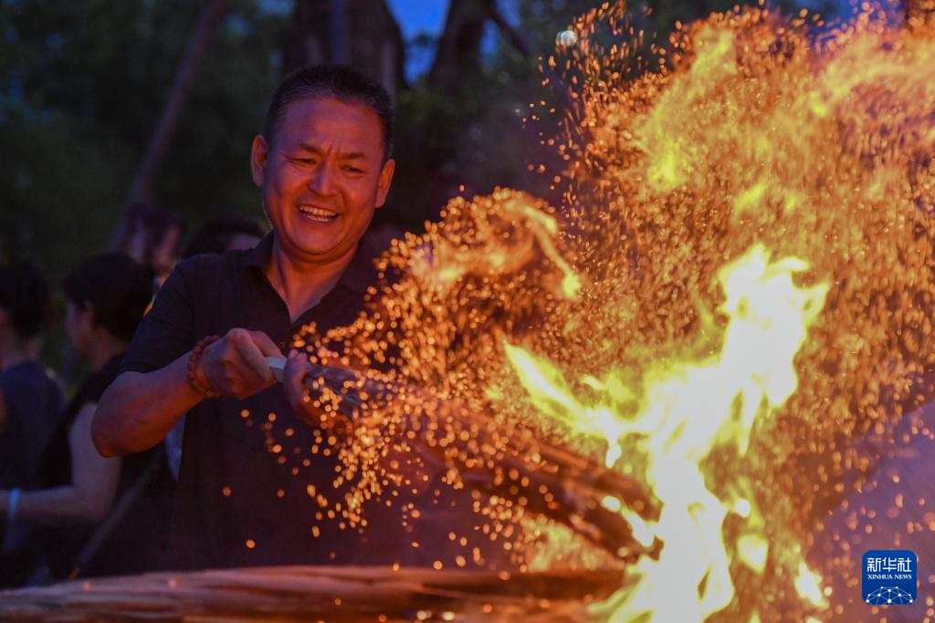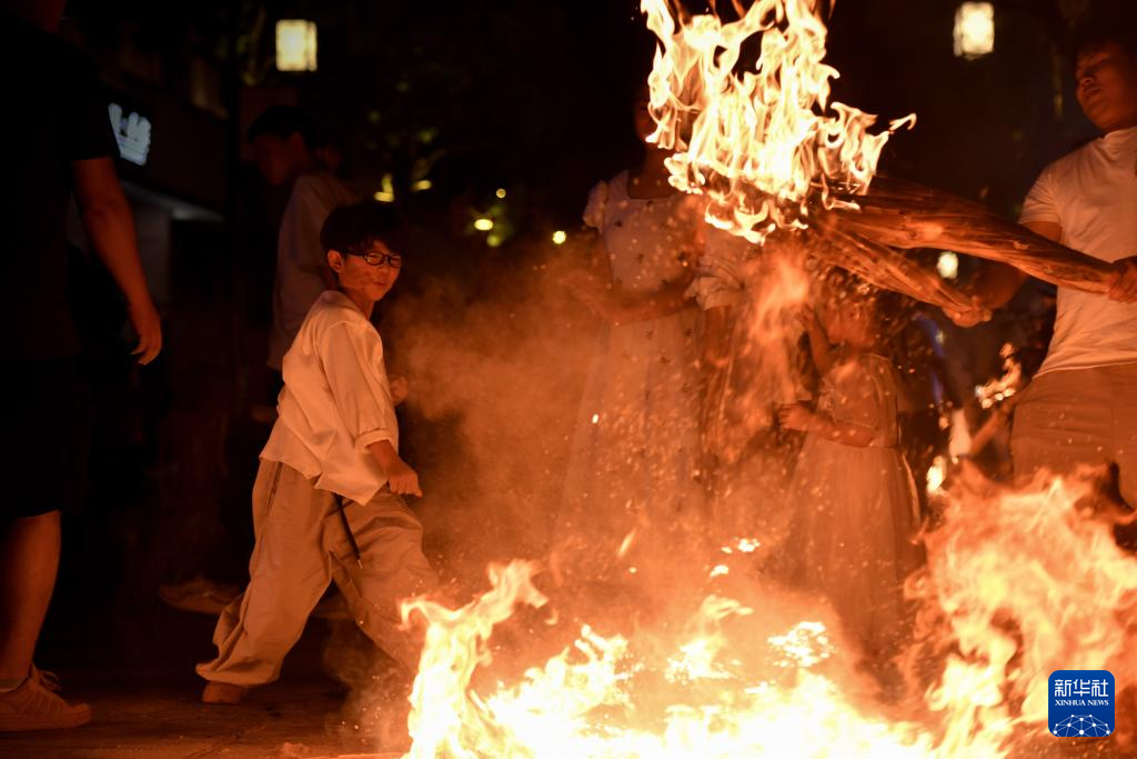 7月19日晚,游客用手机拍摄主火把被点燃的瞬间。