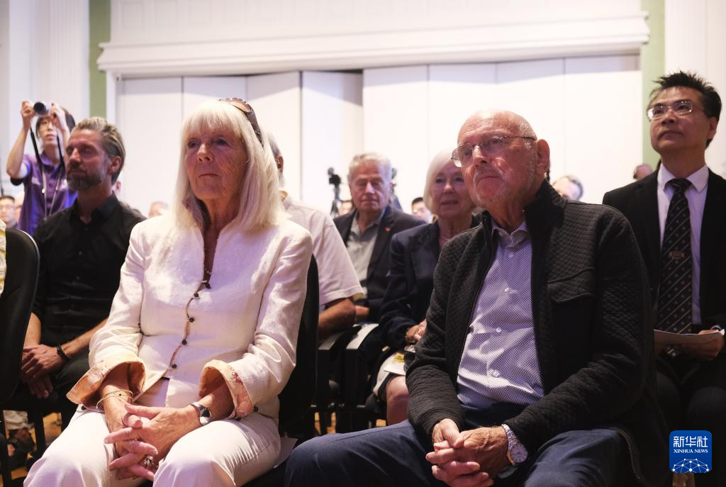 8月21日,在丹麦首都哥本哈根,辛德贝格基金会主席、辛德贝格的外甥女玛丽安·安德森(前左)和辛德贝格同父异母的弟弟奥勒·辛德贝格(前右)参加展览开幕式。
