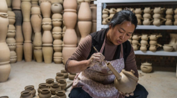 在四川省广汉市三星堆博物馆文创商店,现场快递点工作人员将游客选购的文创产品打包发货(10月30日摄)。