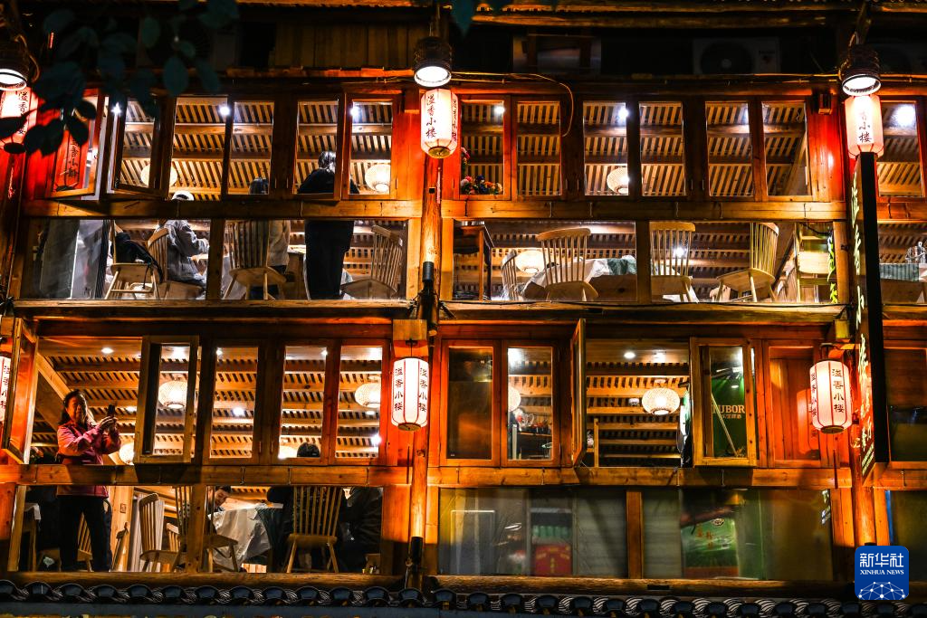 游客在贵州省黎平县肇兴侗寨一家餐厅就餐(12月19日摄)。