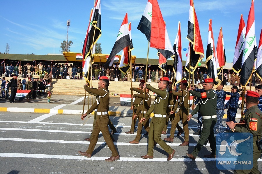 Iraqi military stages parade in Mosul celebrating victory over IS.On Dec. 9, Iraqi Prime Minister Haider al-Abadi officially declared full liberation of Iraq from the extremist IS group after the security forces recaptured all the areas once seized by the extremist group. (Xinhua/Khalil Dawood)