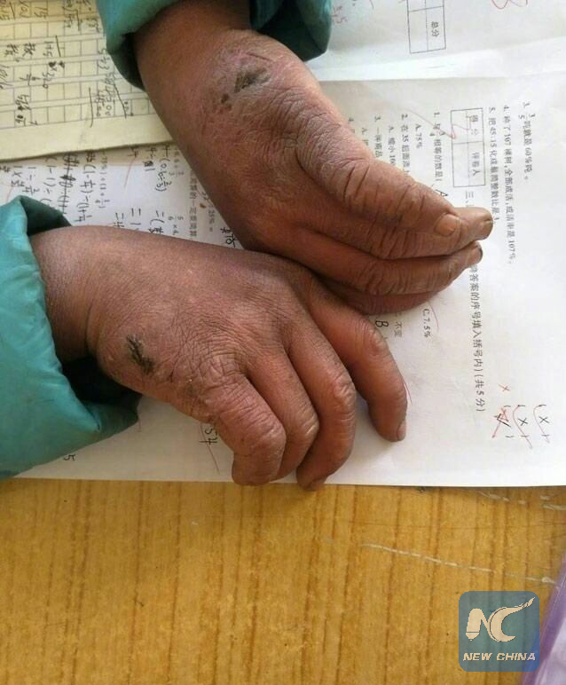 The frostbitten hands of a student at the Zhuanshanbao Primary School. (web photo)