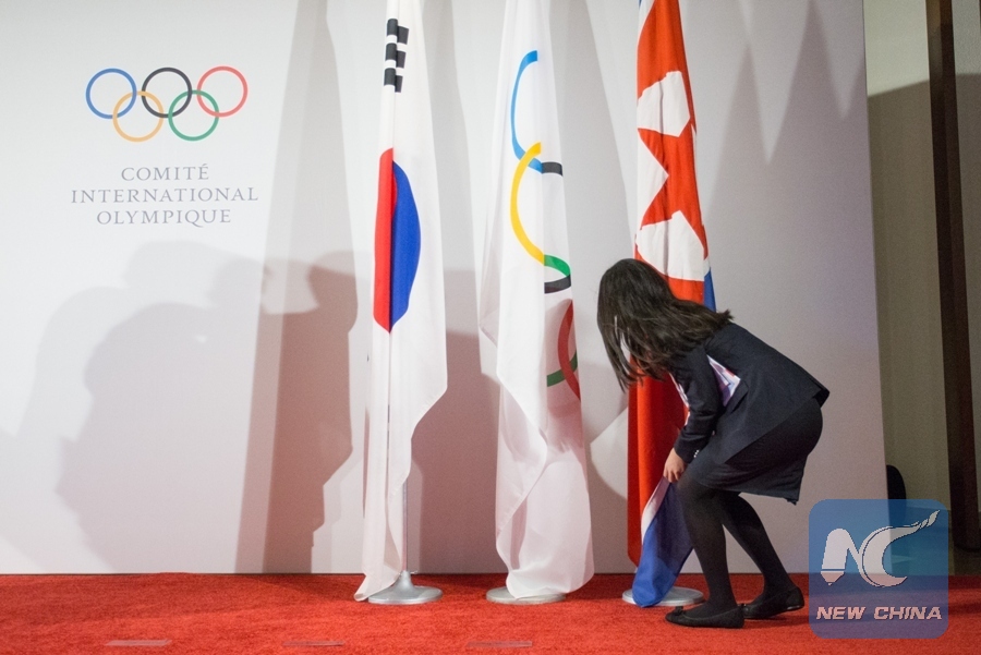A staff member of the International Olympic Committee (IOC) headquarters arranges the flags for welcoming the delegations of the Democratic People's Republic of Korea (DPRK) and South Korea in Lausanne, Switzerland, January 20, 2018. (Xinhua/Xu Jinquan)