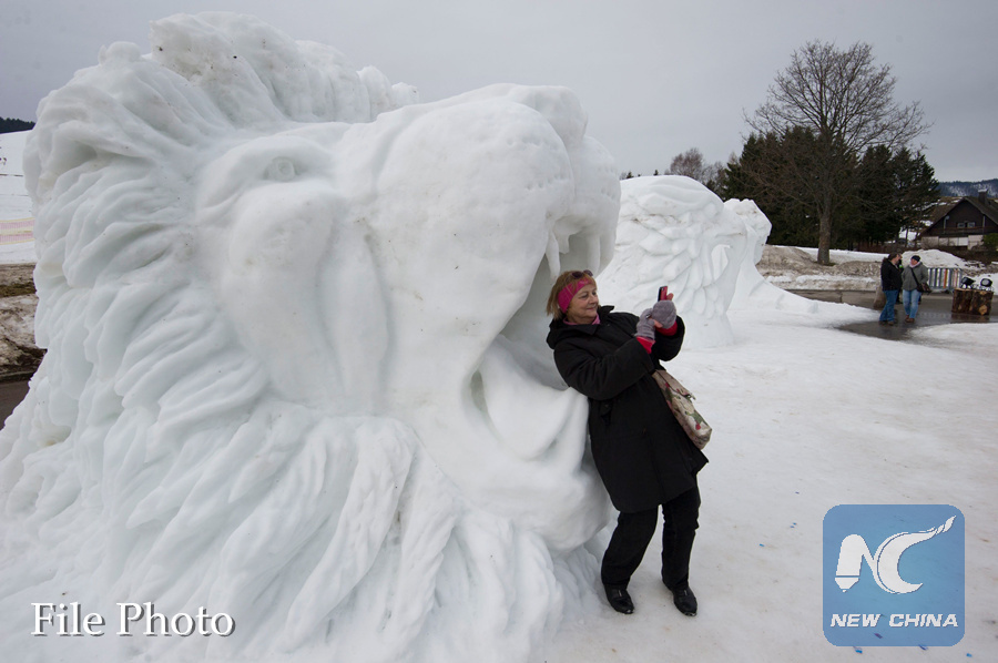 A woman makes a selfie in the mouth of a lion snow sculpture "Powerful" by artists Peter Hermann and Grant Rundbladet of the US at a snow sculpture festival on January 28, 2018 in Bernau, south western Germany. (AFP PHOTO)