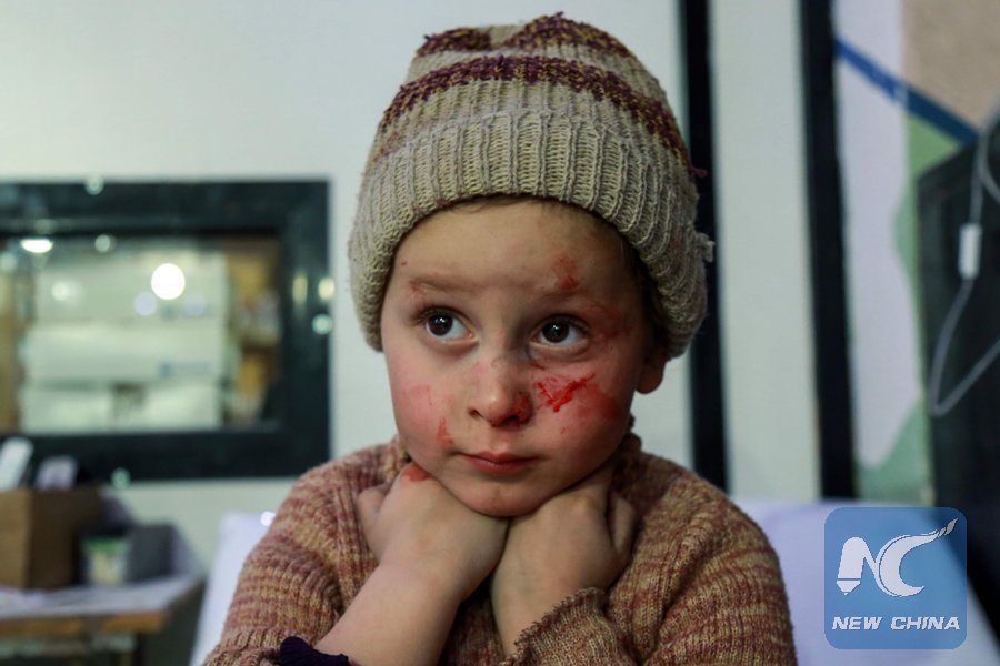 A Syrian child whose face has blood stains looks on while sitting in a makeshift hospital in the rebel-held town of Douma, in the besieged Eastern Ghouta region on the outskirts of the capital Damascus, following reported regime bombardment on March 3, 2018. (Xinhua/AFP)