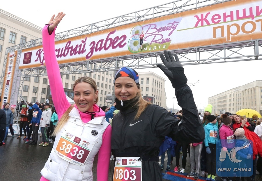 Women participate in the "Beauty Run" to mark the International Women's Day in Minsk, capital of Belarus, on March 8, 2018. (Xinhua)