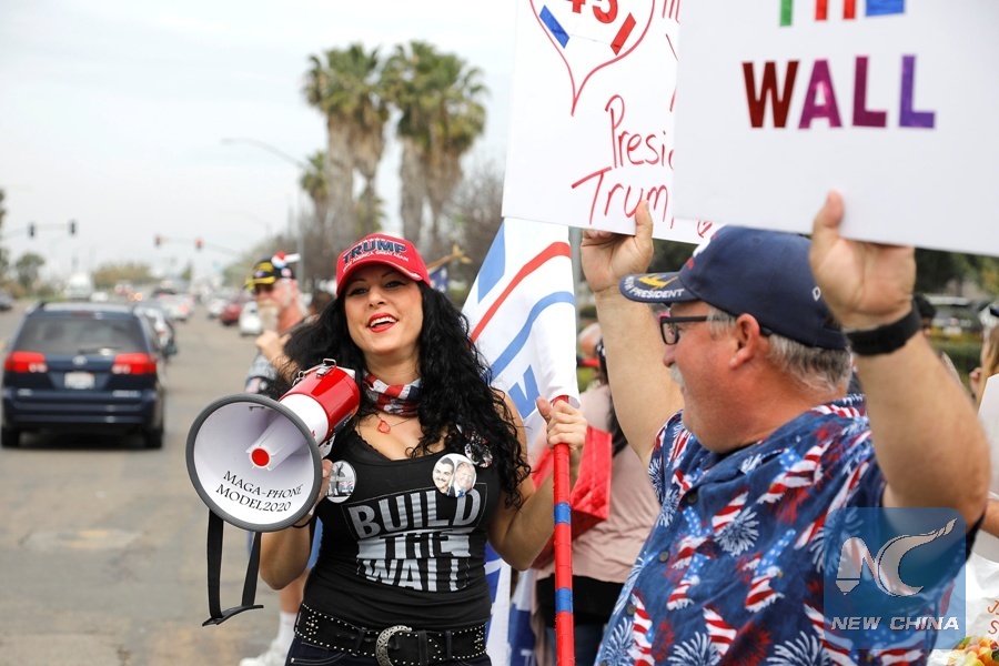 U.S. President Donald Trump's supporters, like Jennifer Harrison, with megaphone, rally near the US-Mexico border for the presidential visit to California to view border wall prototypes in San Diego, California, U.S., March 13, 2018. (Xinhua/REUTERS)