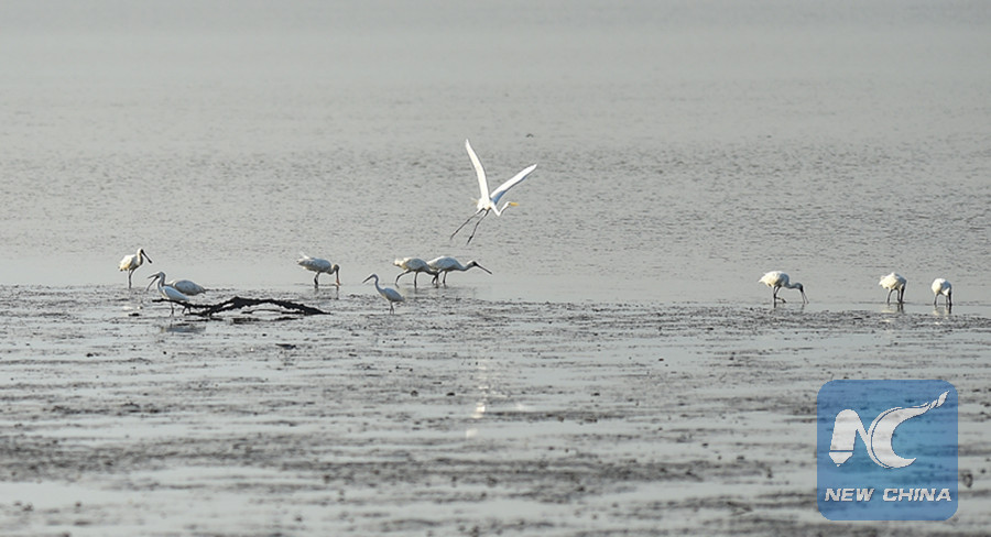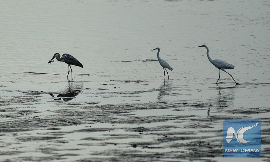 Migratory birds forage at Shenzhen Bay, south China's Guangdong Province, Nov. 9, 2017. (Xinhua photo/Mao Siqian)