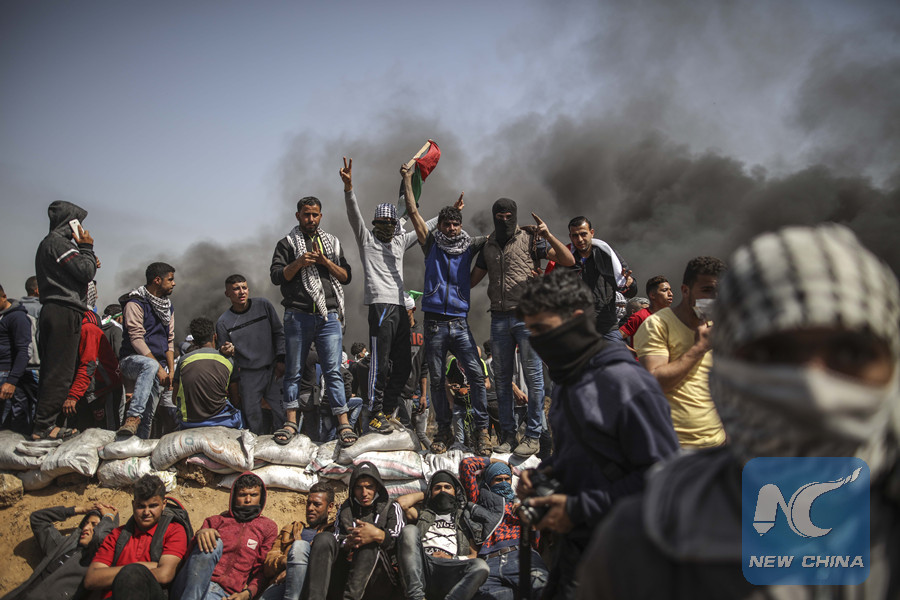 Palestinian protesters take part in clashes with Israeli troops on the Gaza-Israel border, east of Gaza City on April. 6, 2018. (Xinhua/Wissam Nassar)