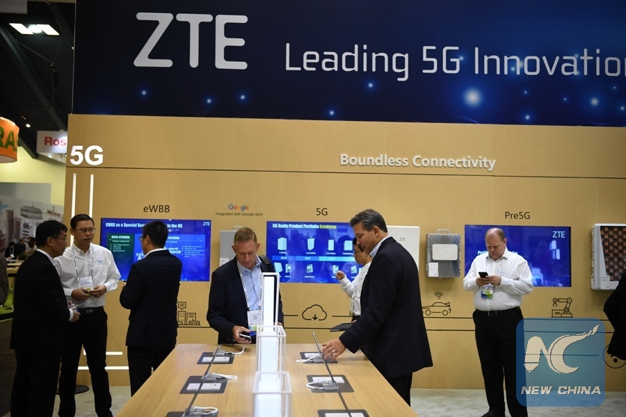 People visit the booth of Chinese telecommunication firm ZTE Corporation during the 2017 Mobile World Congress Americas (MWCA) in San Francisco, the United States on Sept. 12, 2017. (Xinhua/Wu Xiaoling)