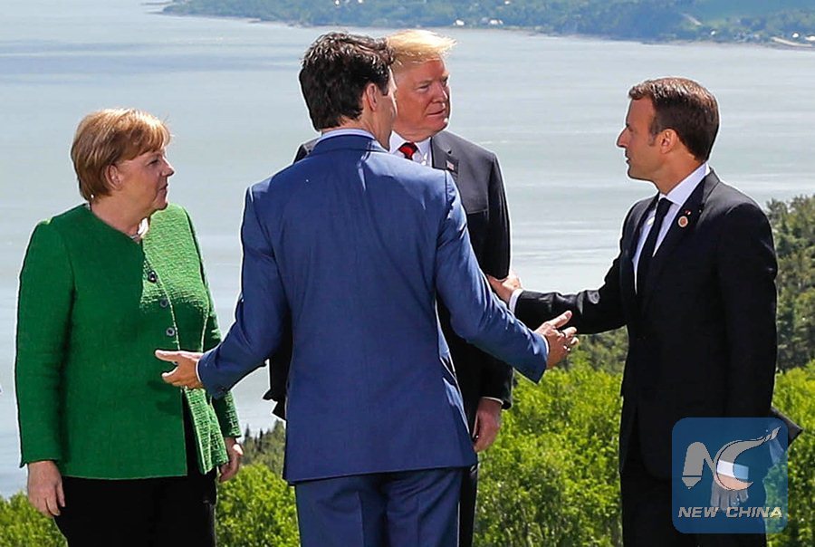 Germany's Chancellor Angela Merkel, U.S. President Donald Trump, Canada's Prime Minister Justin Trudeau and France's President Emmanuel Macron chat during a family photo at the G7 Summit in the Charlevoix city of La Malbaie, Quebec, Canada, June 8, 2018. (Xinhua/REUTERS)