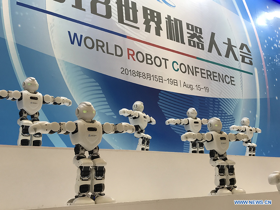 Robots are dancing at the 2018 World Robot Conference in Beijing, Aug. 17, 2018. The conference attracts a total of 166 domestic and international enterprises exhibiting their cutting edge technologies and more than 500 items are displayed at the scene. (Xinhuanet/Liang Yurou)