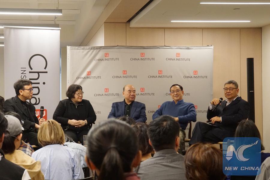 Director of the U.S.-China Music Institute of Bard College Conservatory of Music Jindong Cai (1st L, Rear), composers Chen Yi (2nd L, Rear), Zhou Long (3rd L, Rear) and other guests attend a panel discussion in New York, the United States, on Oct. 20, 2018. The inaugural season of the China Now Music Festival is under way in New York, presenting seven world premieres by some of the well-known Chinese composers in the 21st century. A preconcert panel discussion was held on Saturday at the China Institute. (Xinhua)
