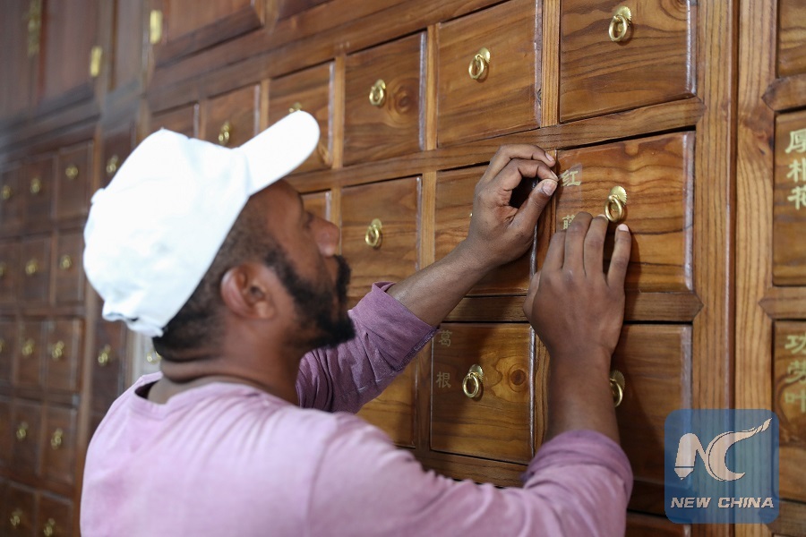 A staff member sticks the Chinese instructions on the Chinese medicine chest at the anti-malaria center in Port Moresby, Papua New Guinea, on Nov. 10, 2018. (Xinhua Bai Xuefei)