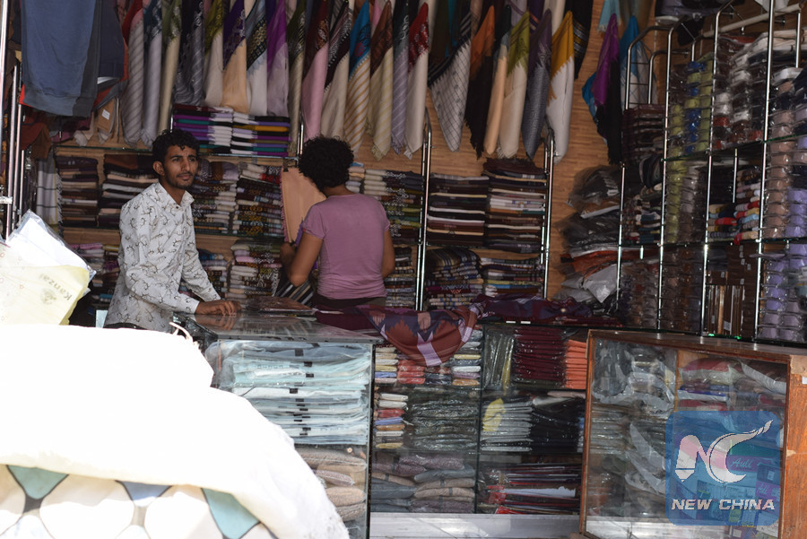 A clothing store owner waits for customers at a market in Aden city, Yemen, on November 20, 2018. (Xinhua/Murad Abdu)