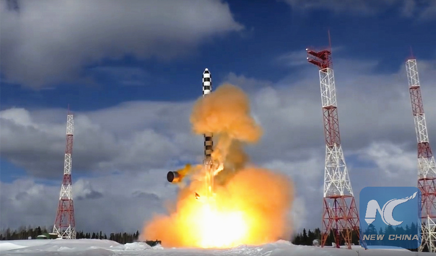 In this image from video provided by the Russian Defense Ministry Press Service, the Sarmat intercontinental ballistic missile blasts off during a test launch from the Plesetsk launch pad in northwestern Russia, March 30, 2018.