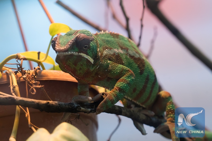 A chameleon is seen at the Metropolitan Zoo and Botanical Garden of Budapest, Hungary on Jan. 4, 2019. According to the "census" held at the beginning of the new year, the Metropolitan Zoo and Botanical Garden of Budapest is home to 8,807 animals from 856 different species, according to a statement published here on Friday by the zoo. (Xinhua/Attila Volgyi)