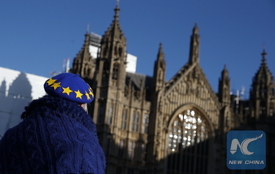 An anti-Brexit demonstrator stands outside the Houses of Parliament in London, Britain on Jan. 22, 2019. British Prime Minister Theresa May said on Monday that she would not back a no-deal Brexit or delay the country's departure from the European Union (EU). (Xinhua/Han Yan)