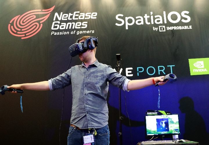 A visitor plays video games at a NetEase booth during the Gamescom 2018 gaming trade fair in Cologne, Germany on Aug. 22, 2018. (Xinhua/Luo Huanhuan)
