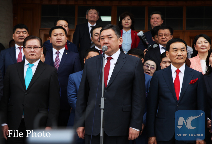 Mongolian Parliament Chairman Miyegombo Enkhbold (C, front) from the Mongolian People's Party (MPP) speaks after receiving his candidacy certificate in Ulan Bator, Mongolia, on May 27, 2017. (Xinhua)