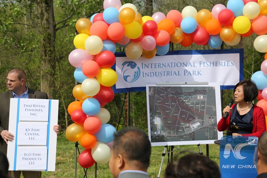 Angie Yu, president of the Two Rivers Fisheries, speaks during the launching ceremony of the International Fisheries Industrial Park in Wickliffe, Ballard County in southeastern U.S. state of Kentucky on April 12, 2019. The industrial park is devoted to Asia carp harvesting and processing. (Xinhua/Xu Xingtang)