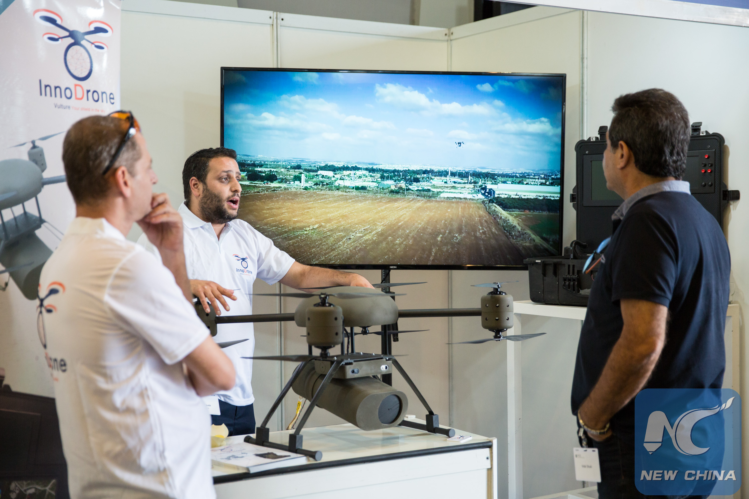 People visit the International Autonomous Unmanned Systems and Robotics Conference and Exhibition at LAGO conference center in Rishon Lezion, Israel, on Oct. 15, 2018. (Xinhua/Guo Yu)