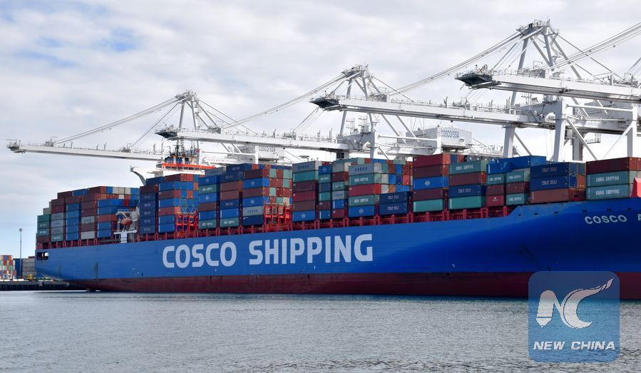 File Photo: Containers of China COSCO Shipping Corporation Limited are seen at the Port of Long Beach, Los Angeles County, the United States, on Feb. 27, 2019. (Xinhua/Li Ying)