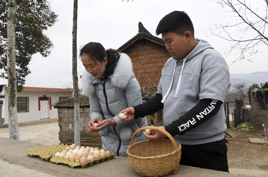Liang Qianjuan (L) counts the eggs purchased from villagers in Shitan Village of Shuiyang Township in Huixian County, northwest China's Gansu Province, Feb. 19, 2019. (Xinhua/Fan Peishen)
