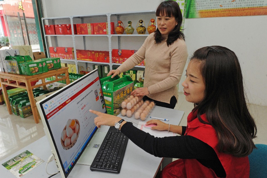 A worker (R) of ule.com, an e-commerce platform of China Post, introduces on-line selling of eggs to a farmer in Jiande, east China's Zhejiang Province, Nov. 24, 2017. (Xinhua/Tan Jin)