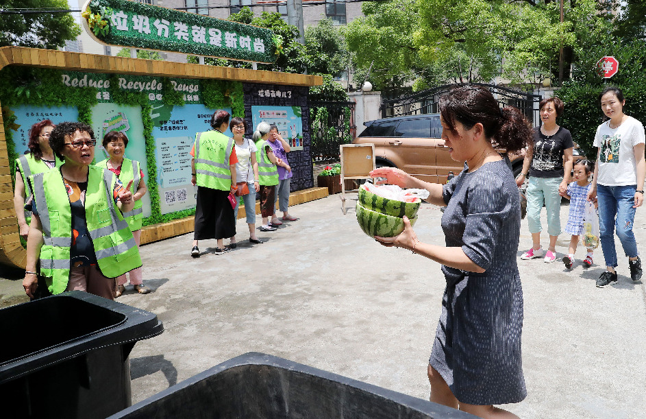 Shanghai is widely promoting a mandatory garbage sorting system, which requires residents to throw away garbage at a fixed time and place. A disposal site is designated for every 300 to 500 households, where volunteers carefully check whether the household waste is accurately classified.