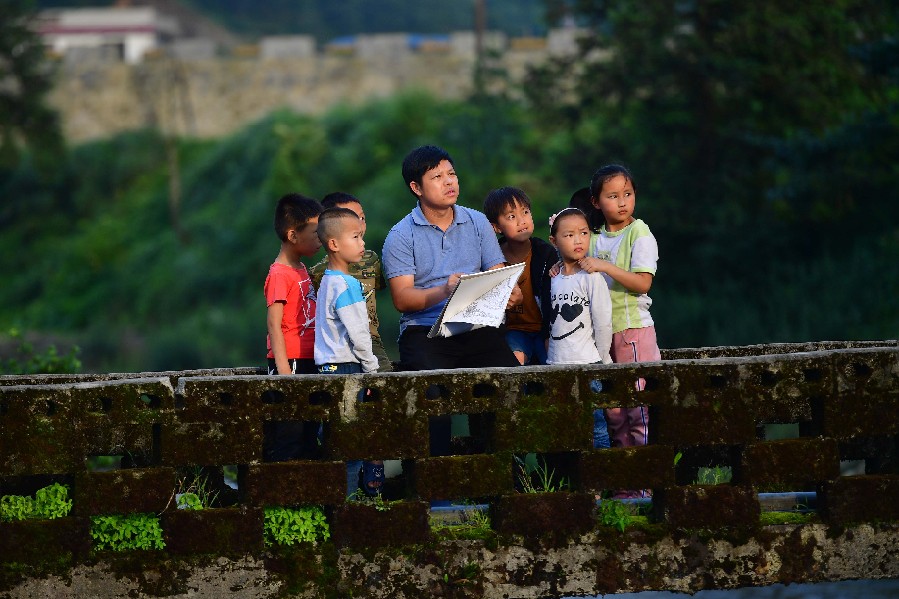 Wei Sancai, a poverty alleviation official who has been assigned to Gaoqiang Village, joins a group of children in an outdoor sketching activity in Rongshui Miao Autonomous County of Liuzhou, south China's Guangxi Zhuang Autonomous Region, July 3, 2019. (Xinhua/Huang Xiaobang)