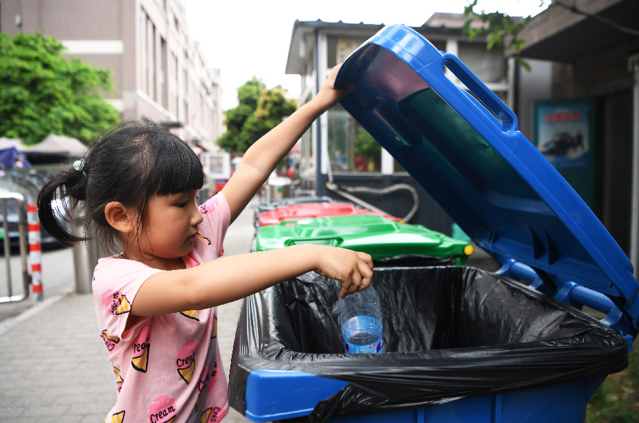 A girl throws a plastic bottle into a garbage can in Chongqing, southwest China, July 4, 2019. (Xinhua/Wang Quanchao)