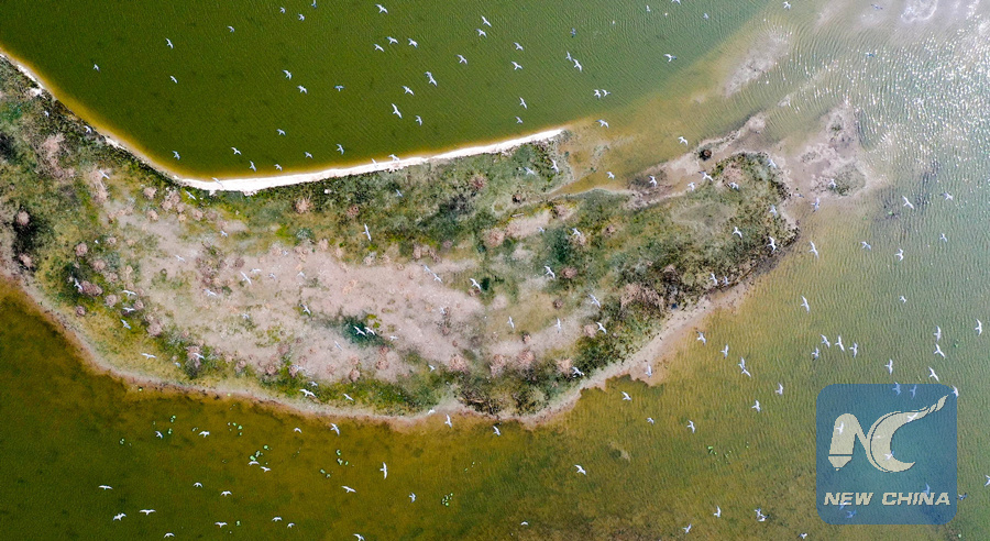 Aerial photo shows terns flying over the Dafeng Milu National Nature Reserve in the city of Yancheng, east China's Jiangsu Province, June 28, 2019. (Xinhua/Li Bo)