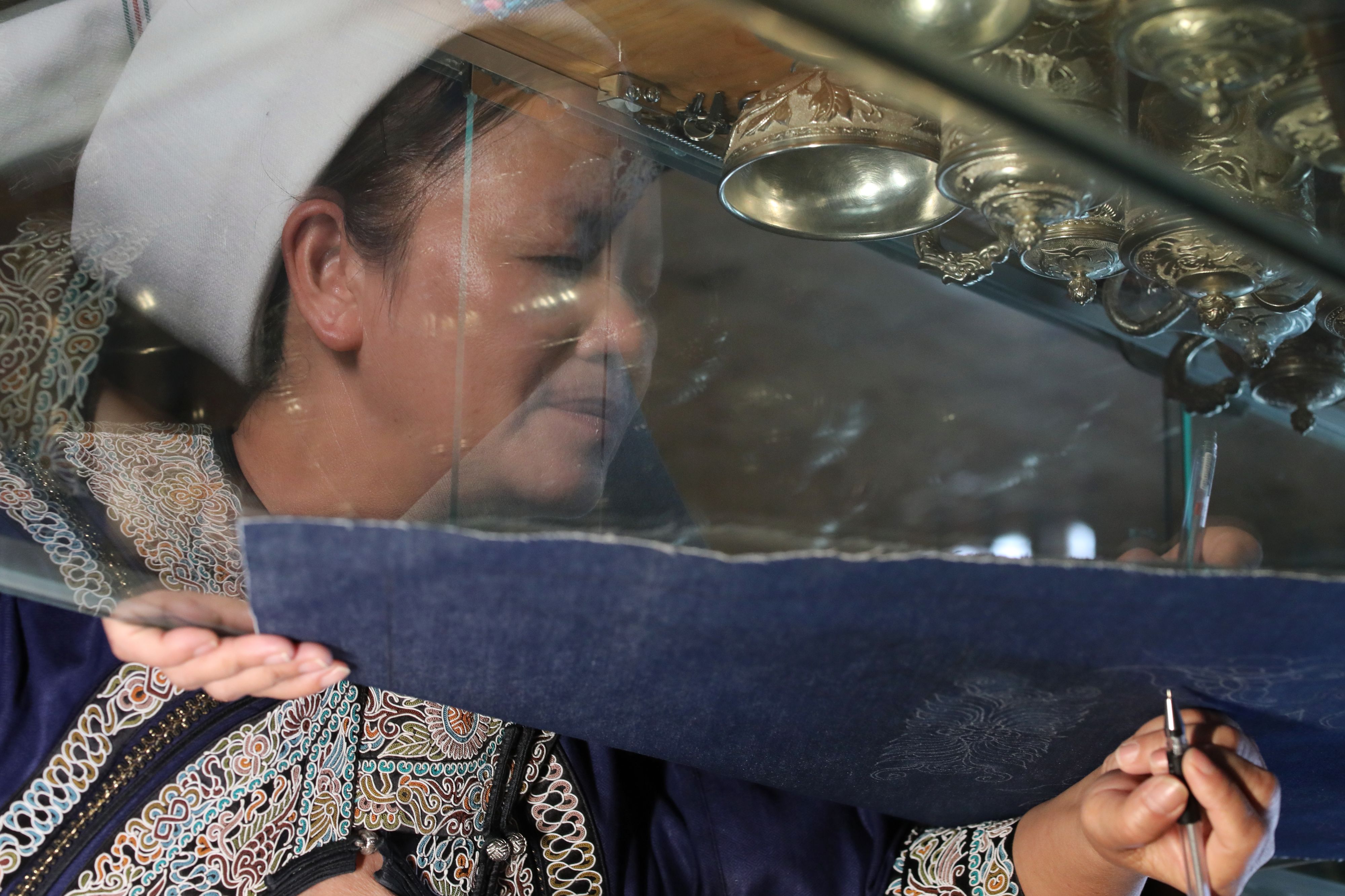 Wei Taohua, an embroiderer of the Shui ethnic group, draws needlework sketches for the traditional horse tail embroidery in Sandu Shui Autonomous County, southwest China's Guizhou Province, July 6, 2019. (Xinhua/Ou Dongqu)
