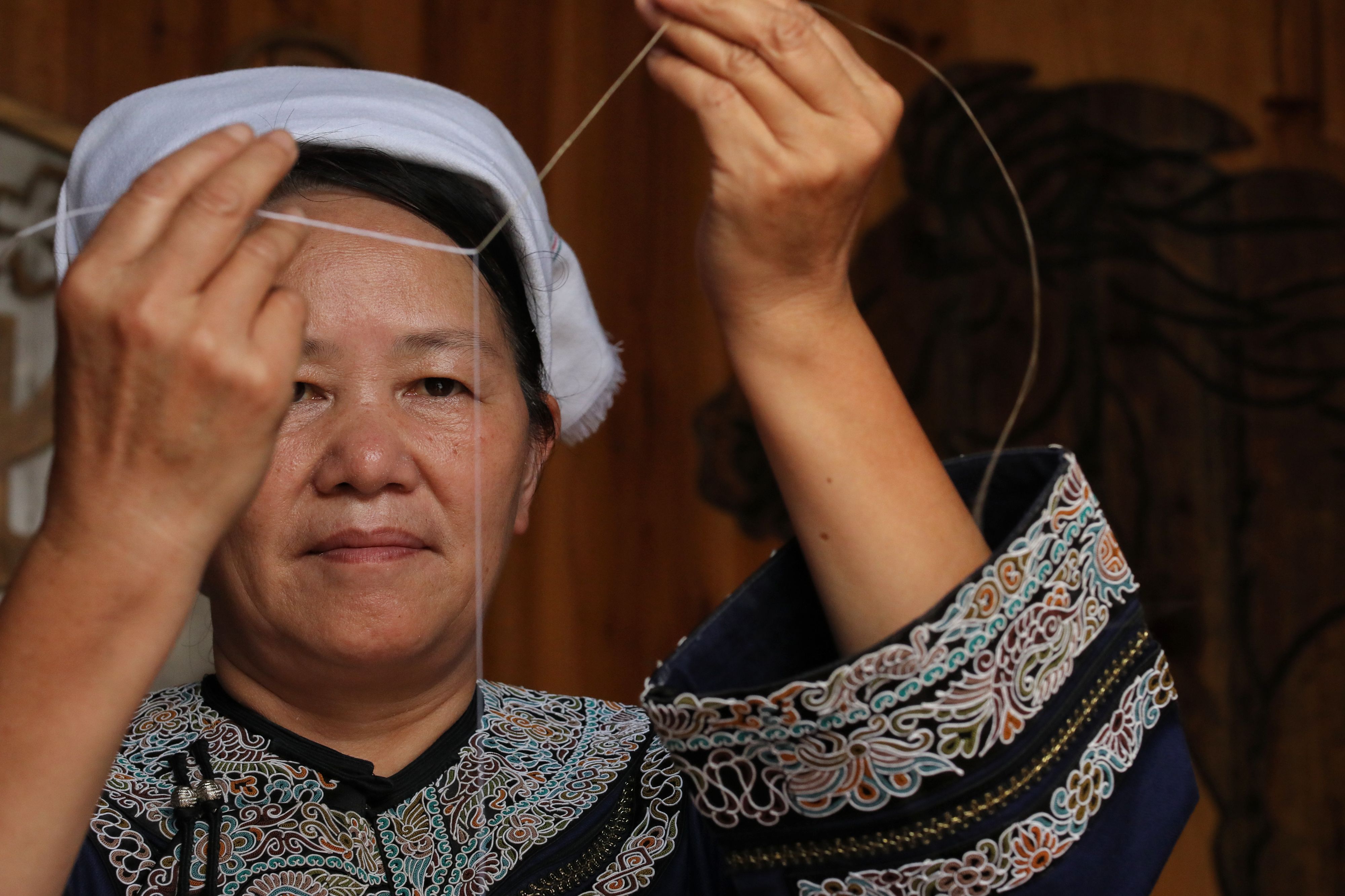 Wei Taohua picks horse tail fibers to make sewing threads for the traditional horse tail embroidery. (Xinhua/Ou Dongqu)